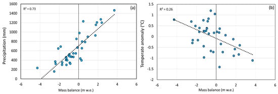 (a) Correlation analysis between glacier mass balance of the Echaurren Norte Glacier with annual precipitation and (b) annual temperature anomalies [65]. It is noteworthy that a higher correlation between mass balance and precipitation is observed (meteorological data from El Yeso weather station, 2474 m a.s.l.).