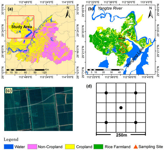 The study area is located in the Dongting Lake region in the northwest of Yueyang city, Hunan province, China, which is an important production base (Figure 1). The lake area is an alluvial plain with an elevation of 34 m [34]. The main land use type of the study area is cropland, specifically, paddy fields [35]. The rice cultivation is mainly single-season. This region belongs to the subtropical monsoon humid climate with sufficient sunshine for growing paddy rice from May to September. The average temperature ranges from 23 °C to 29.1 °C in summer. The annual precipitation ranges from 1100 to 1400 mm, and most of the precipitation occurs from April to June. Twenty points were selected in the study area for experimental sampling.