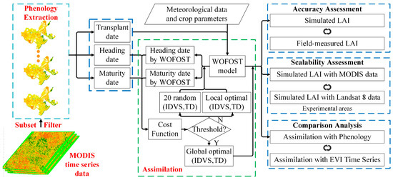 where is the heading/maturity date simulated by WOFOST, and is the heading/maturity date extracted from MODIS (Landsat8) time series data. The WOFOST model and assimilation process are described in detail in our previous studies [22]. The assimilation flowchart is shown in Figure 2. In this study, the assimilation of phenology from MODIS time series data was implemented over the entire study area, and the phenology dates from Landsat 8 were performed in three experimental areas for the scalability assessment of the proposed method.