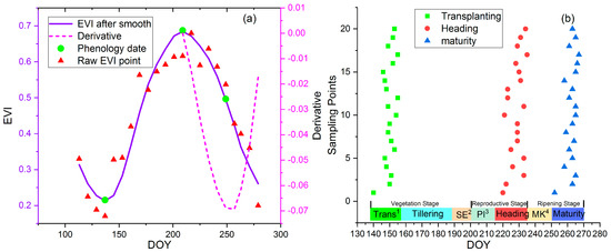 After smoothing, the rice growth cycle can be reflected by EVI time series curves. As the heading date is the peak of the growth period, rice also has maximum EVI values and cover fractions in remote sensing images [27,45]. In general, the rice field is flooded before transplanting and low EVI values are observed during this period [40]. However, with the transplanting of rice, the EVI values will increase. Therefore, it is reasonable to define the transplanting date of rice as the minimal point along the EVI profile. The EVI curve begins to decrease after the heading stage due to the etiolation and senescence of the rice leaves. The maturation date of rice is then identified by the minimum point in the first derivative of the EVI curve [46,47].
