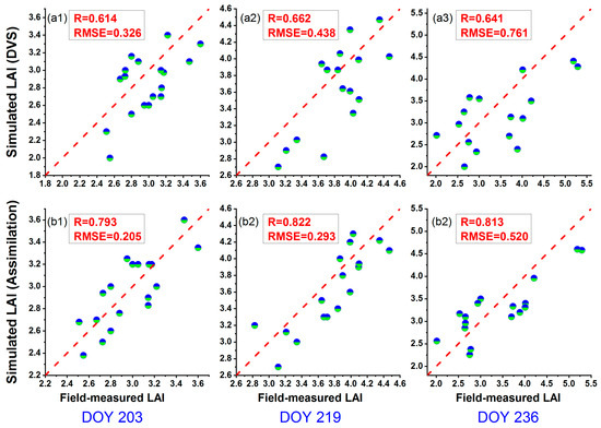 The performance of rice growth simulation under two conditions. (a1–a3): no data assimilation; (b1–b3): phenology-based assimilation.