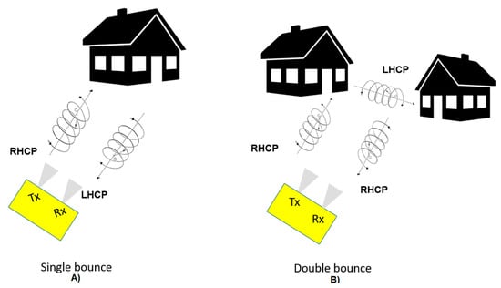 Single (A) and double (B) bounce effect on circularly polarized signal. RHCP: right-handed circular polarization, LHCP: left-handed circular polarization.