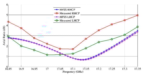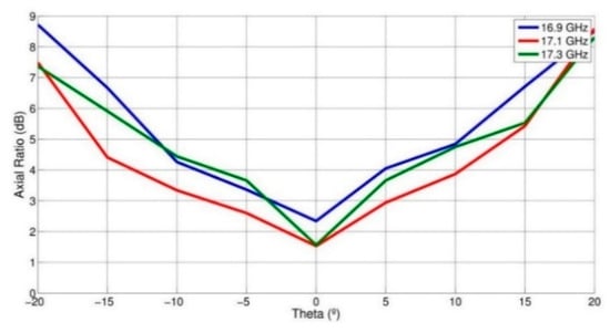 In this study, two type of antennas are used. The acquisition of linear polarized (LP) data is carried out using two pyramidal horn antennas provided by the producer of the apparatus, both with an approximated value of 20 dBi gain. This type of antenna is usually used for its regular phase response, high isolation between orthogonal fields (V/H linear), and high gain. Despite these qualities, with respect to a patch array, plane, and light, this aperture antenna is bulky and heavy. To arrange a multipolarization system able to acquire cross-and co-CP responses, two patch antennas were implemented, respectively, for LHCP and RHCP. As printed antennas, they offer the possibility of low cost, low weight, and scalability to a high gain version compared to conventional horn antennas; this latter condition results in the selection of microstrip technology. The requirements of this antenna array to be used in a terrestrial radar are: (i) An operating band of 17.05 ± 0.15 GHZ [], (ii) sufficient polarization purity in this band, and, finally, (iii) the capability to be mounted into the available radar apparatus. The design of the array is based on the combination of four linear polarization elements to be produced, with an appropriate sequential rotation of the elements and the feeding network, RHCP and LHCP []. The parameter which allows the evaluation of the degree of circularity of a polarized antenna, which is important to assure in this study as a reliable comparison between the different responses of a target when observed through LP or CP observations, is the axial ratio, AR, []. AR is 0dB when the antenna provides a perfect circular polarization; in fact, it varies with the frequency and the direction of the antenna pattern []. In the operating band of the Ibis-S transceiver used in this study, from 16.9 GHz to 17.2 GHz, the AR was calculated during the design of the array, carried out using HFSS software [], and it was also measured in an anechoic chamber. Results of the antenna tests are reported in Figure 2, which shows the comparison between simulated and measured AR as a function of the frequency, and Figure 3, showing the simulated AR as a function the viewing angle theta with respect to the antenna axis for three frequency values spanning the entire operating bandwidth. Observing these results, and considering that 3 dB is usually considered a satisfactory value, the results of the measurements and of the simulation assess a sufficient degree of circular polarization for the implemented patch arrays.