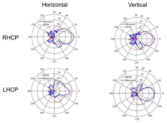 Antenna pattern, simulated through HFSS software [] (dashed lines) and measured (solid line) for the vertical and horizontal plane.
