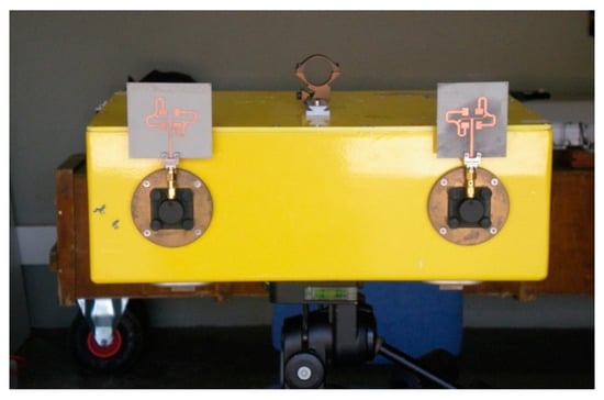This study is based on the use of an apparatus, the Ibis-S [], which in the commercial version, is not provided by multipolarization equipment, acquiring only the co-polar vertical polarization. The design of the radar with polarimetric capabilities, performing simultaneous acquisitions of the different polarization signals, demands an increased complexity of the system: At least two different receiving sections, with different antennas guaranteeing an adequate purity in their polarization response, are necessary. In addition, this approach requires complex calibration procedures, which jointly involves the transceiver and the antennas: See, for example, []. When the simultaneity of the acquisitions is not necessary, because the polarization properties of the observed media are supposed to be stable or slow and varying with time, a single transceiver section can be adequate. In this case, acquisitions with different polarizations can be obtained by simply substituting the antennas in subsequent acquisitions, and only the mutual antenna performances determine the polarization purity of the measurement. On this basis, for this study, two original antennas operating as CP were developed for remote sensing (RS) applications based on ground-based microwave interferometers, in both RAR [] or SAR configurations [,], as an alternative to the standard linear polarized antenna.