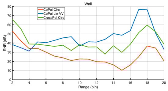 Range profile (1 bin = 0.5 m), obtained in front of a wall with three different polarization configurations: VV (green line), cross-pol circular (red line), co-pol circular (blue line).