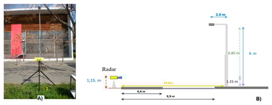 (A) Picture of the experiment setup. (B) Scheme of the measurements carried out to evaluate the response of the system with different polarization configurations in front of a perpendicular dielectric surface: A concrete wall.