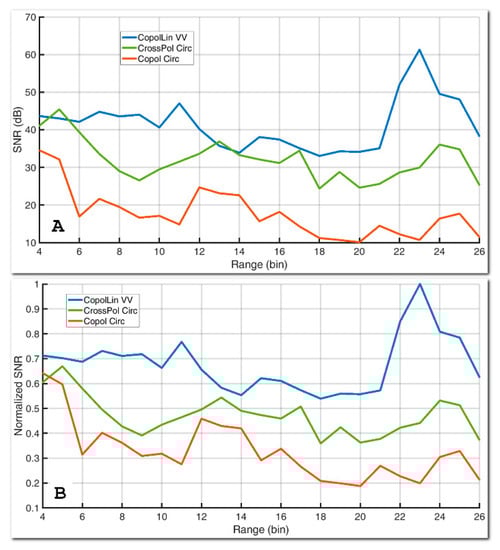 Range profiles (1 bin = 0.5 m), obtained in front of a light pole with three different polarization configurations: VV (blue line), cross-polar circular (green line), co-polar circular (brown line). (A) SNR. (B) Data normalized to the maximum.