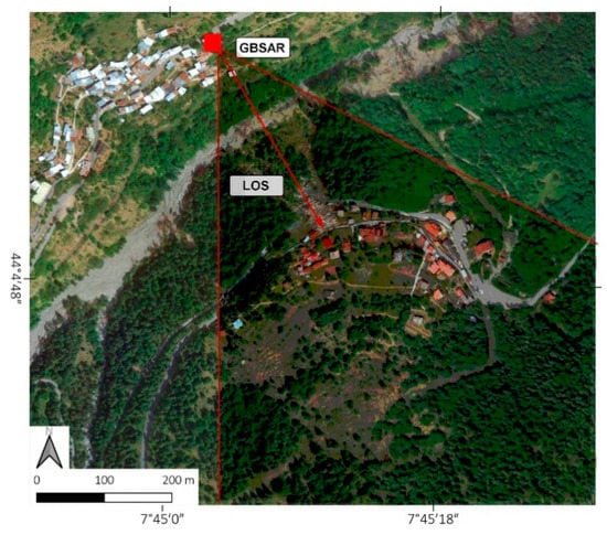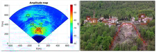 In this section, the data used to analyze the response of different polarization combinations were obtained during a two day long GB SAR image acquisition. The scenario is heterogeneous, consisting of a small urban area, including buildings, and debris due to a landslide; all is surrounded by a vegetated area. Figure 11 shows the orthophoto of the area monitored through the GBSAR. In the centre of the picture the collapsed are is clearly distinguishable, composed of very heterogeneous material: E.g., bricks, rocks, roof pieces, undulated metal plates, soil. The radar data used in this study were acquired during a monitoring campaign organized within a H2020 project (HEIMDALL Project Number 740689 []). The site is a small village located in Northern Italy, at 1300 m asl, namely Monesi di Mendatica, where a large landslide occurred in November 2016, destroying a main road and several buildings, and causing the evacuation of all the inhabitants. The GB-SAR was installed in 2017, in a site in front of the area affected by the landslide, placed at approximately 300 m from the scene, and at the same altitude; therefore, the elevation angle of the radar antennas is zero.