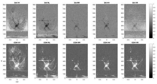 Finally, for the “hybrid configuration”, VR, i.e., transmitting in linear vertical configuration and receiving in RHCP, one can observe a coherence similar to that of RL, but it has the highest DA. This result is not peculiar considering that this combination can be considered at the same time as being partially co-polar (VV) and cross-polar (VH). Observing these results, the two configurations which show a good range in DA and COH are VV and RL; for this reason, we dedicated the second part of the data acquisitions, lasting a longer temporal interval, only to these two combinations (see Section 3.3.2).