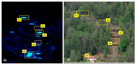Some targets are marked to make it easier to recognize the correspondence between the radar map and the real scene. Figure 13 shows the same radar data of Figure 12A projected on the digital surface model (DSM) to support the data interpretation.