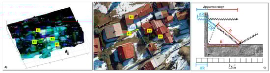 (A) False colour map projected on the DSM; (B) picture of two to four houses with a number label and LOS direction. (C) Scheme of the two scattering modes. The apparent longer range depends on the additional path covered by the radar signal after the first bounce.