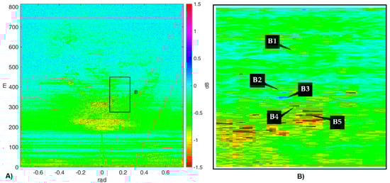 The relative phase between RR and RL was also calculated and analyzed. Nevertheless, we could not find any relevant behaviour, probably because the site is strongly affected by atmospheric effects that disturb the signal and that cause phase wrapping. Finally, in Figure 20, we show the RR/RL amplitude ratio. As expected, the amplitude of the void areas is almost equal, while the amplitude of vegetation is slightly higher for RL. More interesting is the analysis of this variable on the buildings, as shown in Figure 20B. In this case, the RL amplitude is much higher than RR, as already discussed in the previous sections, and it allows identification of the artificial targets, where the RL amplitude is stronger. Nevertheless, the ratio is not homogeneous on all the structures; its analysis reveals where the even/odd bounce modes prevail. In particular, Figure 20B shows that the targets, B4 and B5, reflect mostly in the single bounce mode, while in B1 and B2, the double bounce has a relevant component. On the contrary, B3 reveals that the RR amplitude is stronger than RL because a double bounce process occurs. Observing Figure 19A,B, one can note that the position of B3 corresponds to a flat area just a few meters behind a vertical concrete wall that forms a 90° dihedral where the double bounce occurs. The apparent farther position of the target can be ascribed to the path covered between the two bounces that is summed to the range between the radar and the concrete wall (i.e., the position of the first bounce).