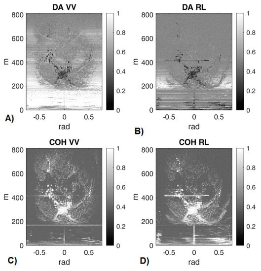 Calculating the probability density function (PDF) of the three ensembles, shown in Figure 23, the following comments can be made, which confirm the previous observations. For RL, the stable targets maintain low values of DA and high of COH, but only COH allows any distinguishing between no signal and vegetated areas: The DA of RL cannot improve the knowledge about these kind of scenarios. On the other hand, for DA in VV and RL, different behaviors are evident for the three sets (see Figure 23A,B).