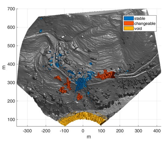 In this case, three areas were defined to further detail the analysis, as shown in Figure 22, where the DA is depicted on the DSM, with different colours for stable scatters (buildings), changeable scatters (mostly trees), and no signal (void).