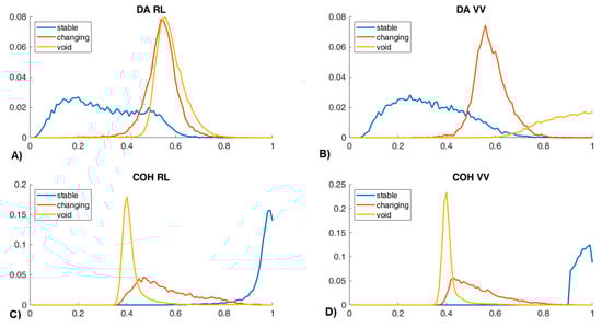 PDF calculated for the three classes: (A) DA RL, (B) DA VV, (C) COH RL, and (D) CO VV.