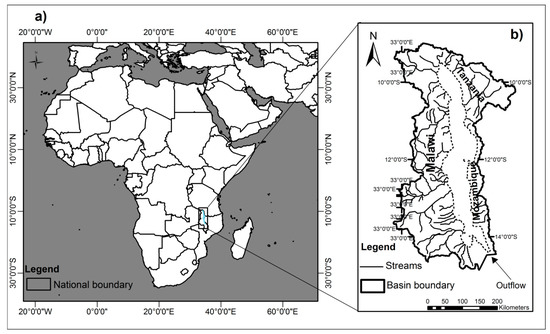 Location of Lake Malawi and its watershed; the lake includs 13 main inflows and only 1 outflow (modified from [4]) (a) Geographical location of Lake Malawi (b) Lake Malawi basin including its adjacent countries.