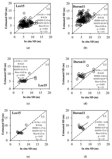 Figure 4 shows comparisons of in situ measured SD in 2007, and corresponding estimated SD values from MERIS data using the Doron11 and Lee15 algorithms, respectively. First, we compared all available in situ measured SD to the estimated SD values from the closest MERIS data without consideration of the time difference between satellite acquisition day and in situ sampling day (Figure 4a,b, N = 173). Results show that the Lee15 algorithm generally performed better than the Doron11 algorithm, with smaller RMSE value of 2.1 m (4.87 m for Doron11) and MAPE value of 30.76% (83.94% for Doron11). The SD values derived from the Doron11 algorithm showed obvious overestimations. In contrast, the SD values derived from the Lee15 algorithm were almost distributed around the 1:1 line. However, the correlations between the estimated and in situ measured SD values were weak for both algorithms, although these correlations were significant (R = 0.24 and p < 0.001 for both).