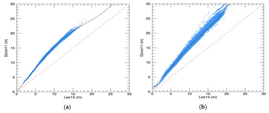 Preisendorfer [31] reported that the value of the numerator of Equation (1) (i.e., Γ) could vary from 5 to 10. In the present study, the values of Γ were calculated in a range of 7.5–8.3, with an average of 7.9, within the range of initially published values. Therefore, we consider that the overestimations of SD values by Doron11 mainly derived from the denominator of Equation (1) (i.e., + ). Previous studies have pointed out that it is difficult to directly estimate from Rrs because of the ratio’s requirement of the backscattering and scattering coefficients, which cannot be obtained from Rrs [32]. In addition, it is well known that the ratio of the backscattering and scattering coefficients can vary temporally and spatially [32,38,39,40]. The Lee15 algorithm overcomes this difficulty, because the algorithm requires only . Therefore, Lee15 algorithm can be considered more robust than the Doron11 algorithm. However, we still found some overestimations in lower SD values and underestimations in higher SD values with the Lee15 algorithm (Figure 4), indicating that further improvements of the algorithm are necessary.