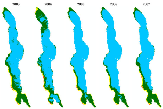 Our results also showed that turbid waters (transparency levels 3 and 4) in Lake Malawi are mainly distributed along the southwestern lakeshore. This is probably because the majority of the inflowing rivers, population, and rainfall are concentrated in the southwestern watershed of the lake [43]. Although no significant water transparency changes were found in Lake Malawi during the study period (2003–2011), continuous monitoring of the lake’s water transparency remains necessary using Lee15 algorithm and more current new sensors such as Landsat 8/OLI, Sentinel-2/MSI, Sentinel-3/OLCI, which have been successfully used for deriving SD values in several previous studies [44,45,46].