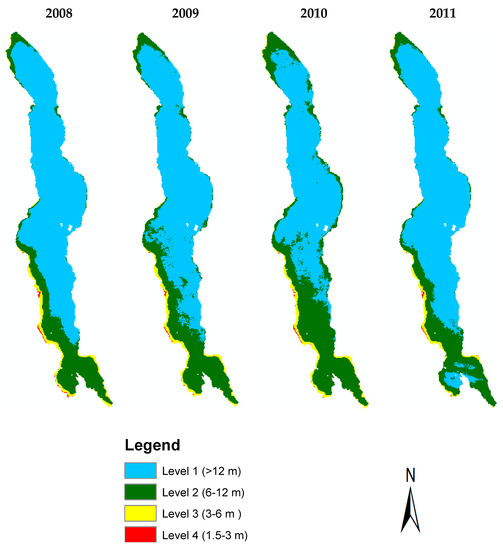 Figure 6 shows yearly water transparency level maps in Lake Malawi, which were generated from yearly SD distribution maps (obtained from MERIS data using the Lee15 algorithm) based on the OECD classification system [36] (i.e., Table 3). The yearly percentages for each water transparency level are summarized in Table 6. From Figure 6 and Table 6, it can be seen that: (1) Lake Malawi maintained four transparency levels throughout the period 2003–2011; (2) waters with transparency level 1 accounted for the largest area in the lake (58.7–79.7%), followed by waters with transparency level 2 (17.3–37.5%) and level 3 (2.2–3.6%), and with transparency level 4 (0.1–0.4%); (3) waters with transparency levels 3 and 4 were always distributed along the southwestern and southern lakeshores, and sometimes found in northern part (e.g., in 2004); (4) the largest change of transparency levels was found between levels 1 and 2; and (5) waters with transparency levels 1 and 2 accounted for more than 95% of the lake.