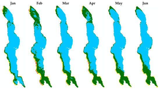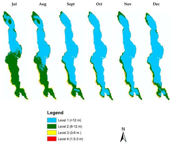 Figure 7 shows monthly water transparency level maps in Lake Malawi, which were generated from monthly SD distribution maps (obtained from MERIS data using the Lee15 algorithm) based on the OECD classification system [36]. The monthly percentages for each water transparency level are summarized in Table 7. From Figure 7 and Table 7, it can be seen that there were several noticeable seasonal variations of SD in Lake Malawi. First, SD values from October–January were generally higher than in other months, and more than 78.5% of the water area was classified as transparency level 1 during the period. Second, the lake water was more turbid in February, April, July, and August than in other months due to water areas with transparency level 2 constituting more than 31.3% in these months; July, in particular, was dominated by water transparency level 2 (59.4%). Third, Lake Malawi was dominated by transparency levels 1 and 2 throughout the year (more than 95%), but the other two water transparency levels (i.e., levels 3 and 4) were also found in the lake each month.