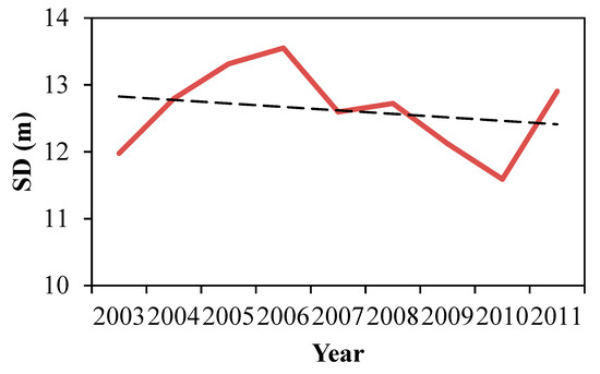 Figure 8 shows yearly averaged SD values in Lake Malawi from 2003 to 2011. Although a slightly decreased trend of SD values was observed, the change was not significant in Lake Malawi during the nine years (R2 = 0.051; p > 0.05). The highest and lowest yearly averaged SD values were observed in Lake Malawi in 2006 (13.6 m) and 2010 (11.6 m), respectively.