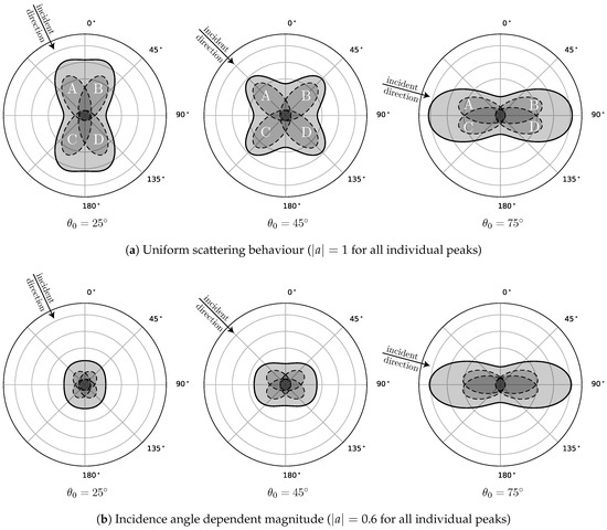If values of are used, the magnitude of the resulting scattering-pattern increases with increasing incidence-angle as illustrated in Figure 3b. While such a parametrization leads to a violation of the normalization condition for volume-scattering phase-functions (see Section 2.1.2), it can be used as a single-parametric way to mimic an incidence-angle dependent normalization for representations as addressed in more detail in Section 2.1.3.