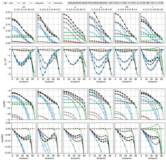 Illustration of the behaviour of modelled as well as the resulting soil-, vegetation- and interaction-contributions and the corresponding slopes with respect to changes in the model-parameters in linear- (top) and dB (bottom) scale.