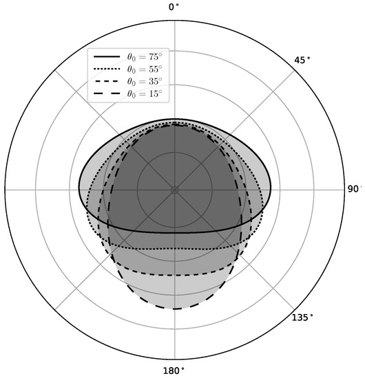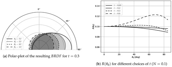 The scattering-angle generalization-parameter a is hereby restricted to which allows adjusting the incidence-angle dependency such that the magnitude of the scattering pattern is increasing with increasing incidence-angle (see Figure 4 and Figure 5). To obtain a simple way for specifying the magnitude of the , the normalization-factor in (10) is defined such that the parameter N represents the hemispherical reflectance at nadir. is therefore found by evaluating (9), at i.e.,: