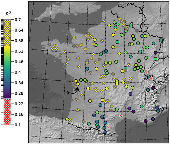 ISBA simulations driven by SAFRAN were compared to in situ observations of SSM in south-western France by Albergel et al. [29] and Draper et al. [30], using 12 stations of the SMOSMANIA [31] observation network. The obtained Spearman temporal correlation coefficient value ranges from 0.6 to 0.8 and the median value is 0.7.