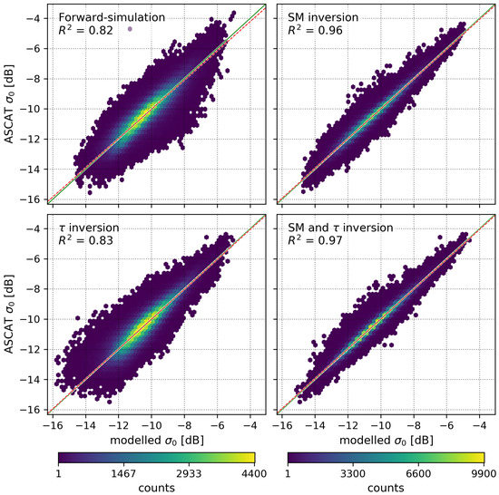 The ASCAT- dataset consists of backscattering measurements with incidence-angles ranging from 25 to 65 degrees, where 3–6 individual measurements at different incidence-angles are available at each day. In an ideal framework, one would set-up the model-parameter estimation as a fully automatic scheme that is capable of retrieving both daily soil-moisture estimates as well as temporally varying estimates for and the remaining scattering-function parameters. However, considering the available dataset, it is evident that this would result in an extremely under-determined retrieval procedure, where numerous possible parametrizations exist that would all be capable of representing the given daily backscattering measurements within reasonable accuracy. Therefore, the complexity of the parametrization was reduced by representing the temporal dynamics of the dataset exclusively via the optical depth () and the nadir hemispherical reflectance of the (N). All other parameters that are intended to represent geometrical and structural properties of the observed scene (pixel) are assumed to remain constant over the considered time-period. Furthermore, since the effects of some parameters can be very similar for a monostatic measurement geometry, the fit-procedure is restricted to obtain spatially varying estimates only for the effective bare-soil fraction (), the asymmetry-factor of the (t), the single-scattering albedo () and the scaling-factor () that relates soil-moisture () and N (as defined in (13)). All remaining parameters are kept both spatially and temporally constant, and the numerical values are set based on empirical attempts to adjust forward-simulation and inversion-performances over the chosen test-sites. The resulting dependency of modelled on the dynamic parameters is illustrated in Figure 7. To show the flexibility of the modelling approach, results for 4 different experiments based on the selected parametrization are shown in Section 4: