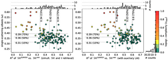 The reason for this discrepancy is that most studies aiming to retrieve soil-and vegetation parameters from passive microwave observations imply so-called “effective single-scattering albedo () parametrizations that are defined to implicitly include multiple scattering effects [43]. The numerical value of this effective albedo is generally found to range between 0. and 0.15 [40,43,44]. It is important to notice that such effective single-scattering albedo values are strongly dependent on the retrieval-model used for obtaining the values, and connections between the -values retrieved from passive observations and the actual -values are not straightforward as can be seen for example from the works of Kurum et al. [43,45,46,47].