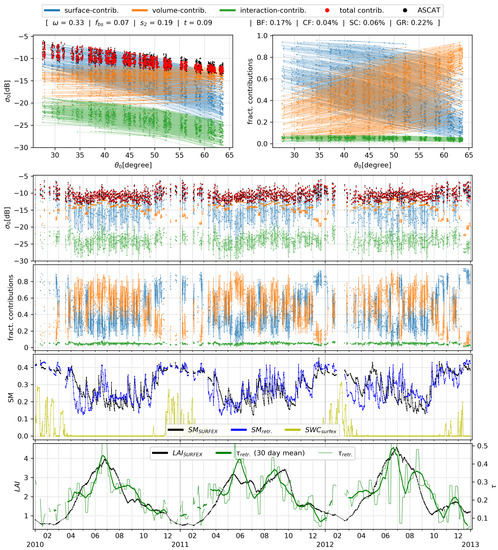 To connect the results of the above introduced modelling approach to indices that are related to soil- and vegetation properties, a relation between the parameters of the model and the desired biophysical variables is set. Within the following simulation, we investigated the performance of the modelling approach to simulate backscattering coefficient measurements from the ASCAT instrument by using simple empirical relations to connect the optical depth to the leaf-area index and the nadir-hemispherical reflectance N to the soil-moisture content :