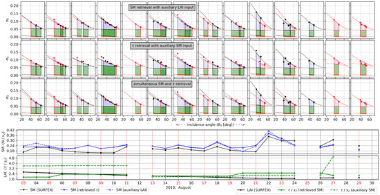 - A subset of parameters is chosen to represent the remaining spatial variability of the dataset that is not covered by variations in and N. Since the numerical values of those parameters can a priori only be restricted to a physically plausible range, the actual values for each scene are obtained by an optimization-procedure using inputs of auxiliary Leaf Area Index (LAI) (assumed to be ) and soil-moisture () (assumed to be ) timeseries provided by the Interactions between Soil, Biosphere, and Atmosphere (ISBA) land-surface model within the SURFEX modelling platform [12].