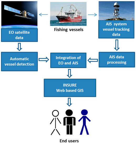 The INSURE system is designed to operationally manage and report on a synthetic data stream that comprises data from EO and AIS sources. A schematic diagram of the system is presented in Figure 1. The system benefits from using both active microwave and optical remote sensing data provided by the Sentinel-1 SAR and Sentinel-2 MSI, respectively. By cross-checking the remote sensing observations with information obtained from AIS, non-cooperative vessels are revealed and reported via the web-based Geographic Information System, referred to here as the INSURE web portal.