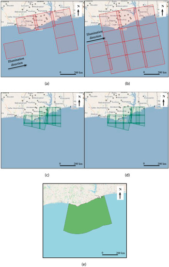 For the Ghanaian coastal region, Sentinel-1A ascending pass scenes were available with some limitations in coverage (Figure 2a). Recent augmentation of Sentinel-1 coverage with Sentinel-1B scenes (Figure 2b) helped to address this limitation, providing more extensive coverage in the offshore environment around Accra.