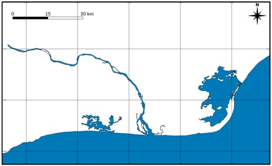 A section of a Ghana land–water mask generated using Sentinel-1 SAR data (from left to right: Songaw Lagoon, River Volta, and Keta Lagoon).