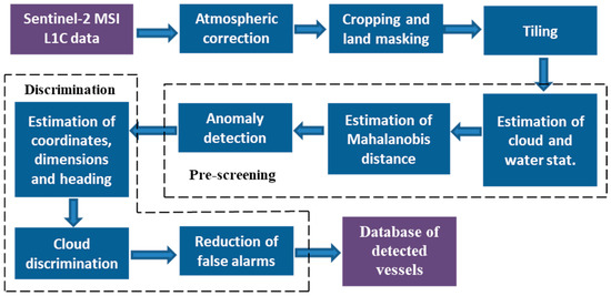 The system processing chain manages multiple processes in a scheduled, automated fashion, including: database management, checking for new scene availability, downloading and staging of EO scenes, scene calibration, scene masking and mapping, vessel detection, checking for AIS data availability, AIS data ingestion, vessel matching, image generation and statistical reporting, and staging for portal visualisation.