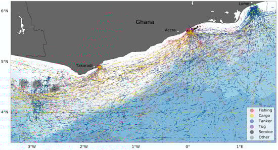Figure 11 shows the classification of all vessels’ positions extracted from the AIS record. Tankers, when not in transit, are predominantly clustered around the port of Lome in Togo, and in proximity to the offshore oil platforms around 3 degrees West. Service vessels, mostly associated with the oil and gas industry, are similarly focussed in the latter region, while cargo vessels operate in the proximity of major ports when not in transit. Fishing vessels, by comparison, are either confined to the ports and inshore regions or involved in open-ocean transit.