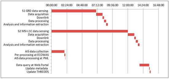 Overall, the analysis of the Gantt chart in Figure 20 shows that the total latency of the INSURE system is too high for near real-time (NRT) vessel surveillance applications. Large delays in the information processing chain increase vessel search area and the chance of escaping from the coast-guard patrol. However, a 2-hour delay is usually considered acceptable for NRT surveillance applications. The INSURE system latency can be reduced to less than 2.5 h if the delay in accessing satellite data can be reduced to 1 h, e.g., by gathering data from local ground stations.