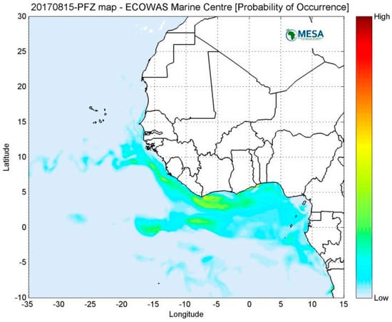 Further benefits can be achieved by combining the INSURE data with marine environment information derived from ocean colour, sea surface temperature (SST) and Chl-a products. To evaluate the damage caused by IUU fishing the locations of non-cooperative vessels can be combined with the maps of potential fishing zones (PFZ), generated by ECOWAS Coastal and Marine Resource Management Centre (ECMRMC), the University of Ghana [41] (see Figure 21). The PFZ maps are developed from fish catch data derived from catch log-books from industrial fishing fleets which target tuna, fishing vessel traffic information extracted from AIS data and ocean surface parameters such as Chl-a, sea surface temperature, salinity, heights and currents. These parameters are input into a generalized additive model (GAM) to derive a forecast of potentially productive fishing areas within the continental shelves and oceanic regions of Western Africa. Figure 21 shows an example PFZ map generated by the ECMRMC.
