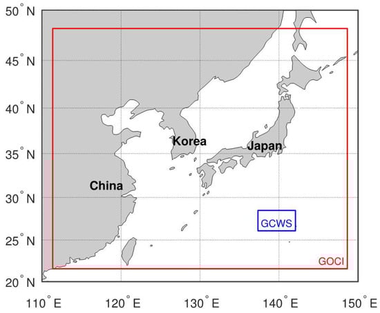 The study area (GCWS region; blue box) is located over oligotrophic waters to the south of Japan within the coverage area of GOCI (red box). The GCWS region covers 433 × 968 pixels, which is equivalent to 100,000 km2.