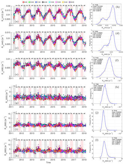 Time Series and histograms of remote sensing reflectance (Rrs(λ)) (a,b) Rrs(412), (c,d) Rrs(443), (e,f) Rrs(490), (g,h) Rrs(555), (i,j) Rrs(660), (k,l) Rrs(680) products for the GCWS region. The complete GOCI mission was processed to Level-2 and a filtered mean was calculated for each image over the GCWS region. The data are color coded by time of day in local time. Labels are summer (su), fall (fa), winter (wi) and spring (sp). The histograms show the total number (N), mean, maximum, minimum and standard deviation (SD) of the values that passed the exclusion criteria.