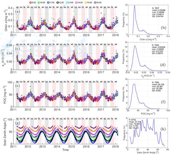 Time Series and histograms for the (a,b) Chl-a, (c,d) ag(412), (e,f) POC products and (g,h) solar zenith angle for the GCWS region. The data are color coded by time of day. See Figure 3 for additional details.