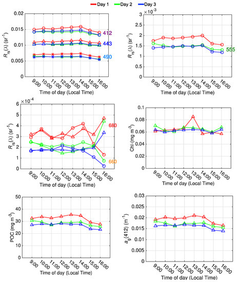 First, one three-day sequence is provided as an example and then, results are shown from all valid three-day sequences used to obtain a quantitative estimate of the sub-diurnal to day-to-day variability. Under ideal circumstances, if the water is temporally and spatially homogeneous, we would expect that all the values during the day to be the same and the values for all the three-day sequences to be the same too, at least within the uncertainty of the satellite sensor calibration and algorithms applied. This assumes that the atmospheric correction algorithm is properly compensating for changes in aerosol and atmospheric gas composition, solar and viewing geometry that influence atmospheric radiant path reflectance, surface reflection/refraction effects and the bidirectional reflectance of the subsurface light field [].