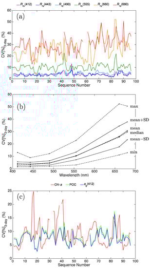 Diurnal variability in GOCI-derived (a) Rrs by sequence number, (b) Rrs by wavelength and (c) biogeochemical products demonstrated in terms of the coefficient of variation for each of the 96 three-day sequences of hourly observations (). Minimum (lower dashed line), maximum (upper dashed line), mean (solid bold black line), median (dashed bold black line) and +/−1SD (solid thin line).