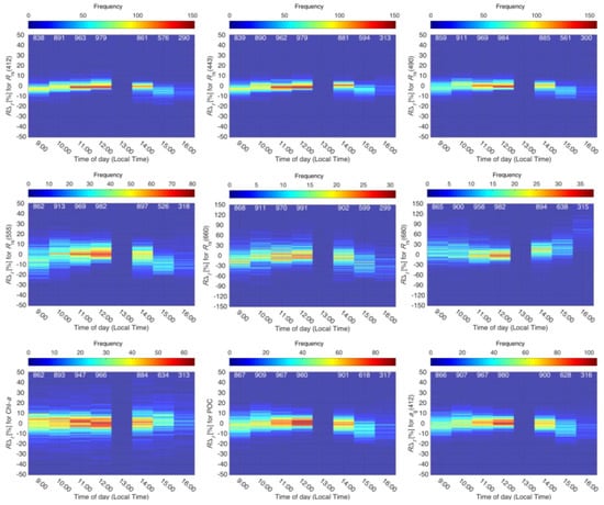 Relative difference RΔt[%] with respect to the value at 13:00 hours for (a–f) Rrs(λ) and (g) Chlorophyll-a, (h) POC and (i) ag(412). The color corresponds to the number of RΔt[%] values (or frequency) to demonstrate the dispersion of RΔt[%] by hour of observation for each data product. The sample size for each time of day are indicated in the top of the figure (white font).