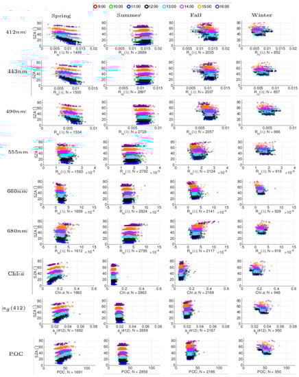Overall, the relative difference with respect to the value at 13:00 hours (RΔt[%]) are less than 10% for all products except Rrs(660) and Rrs(680) and there is no indication of skewing of the diurnal variability due to processing (Table 2; Figure 7). A similar behavior occurs for the other biogeochemical products examined, with a relative difference less than 10% for all times of the day. It appears to be a small effect from SZA at the beginning and end of the day presumably due to reduced amount of sunlight and thus reduced SNR of the sensor. However, the effect of SZA is very minimal and no significant trend is observed. When the GOCI data versus SZA were analyzed (Figure 8), separated by seasons and by time of day, no trend was observed. Summer seems to yield the most ideal data for evaluating GOCI in this study area because of the very narrow variability for all products. Spring is more variable in the Chl-a levels, as a consequence of phytoplankton production (Figure 8). The same behavior can be seen for ag(412) and POC. From these two analyses, it seems that the time of day and therefore the SZA, does not have a significant negative impact on the results that passed the filtering criteria, demonstrating that the atmospheric correction algorithm is working adequately, even at extreme SZA (SZA > 75°). It is worth pointing out that this holds true only if a proper vicarious calibration is applied. Before updating the vicarious gains, low or negative Rrs values were observed at extreme SZA.