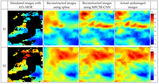 In this section, we simulated initially contaminated GLST images with different MDRs (53, 65, and 70%) on undamaged clipped GLST image patches. The simulated contaminated GLST image patches were reconstructed using the proposed model and the classic spline spatial interpolation method, then assessed compared to the original GLST images with the RMSE index. In addition, for the actual experiments, FY-2G and SEVIRI LSTs with about 50% MDR were tested using the proposed MFCTR-CNN method.
